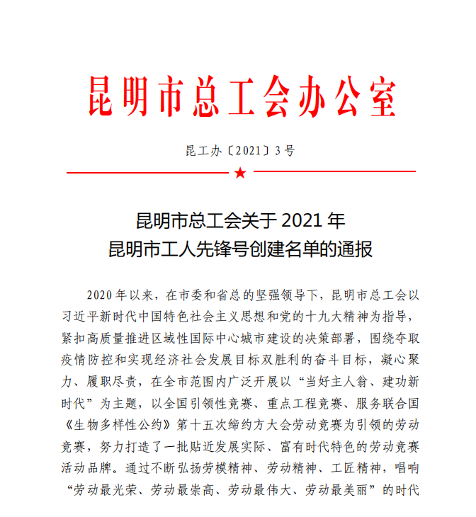 日前,康澤大業(yè)公司成功創(chuàng)建為2021年昆明市“工人先鋒號”,是康澤大業(yè)公司慶祝中國共產黨成立100周年取得的又一優(yōu)異成績。