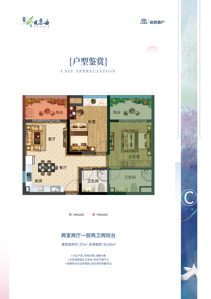 C戶型57㎡ 2房2廳1廚1衛(wèi)+2陽臺(tái)=83.65㎡